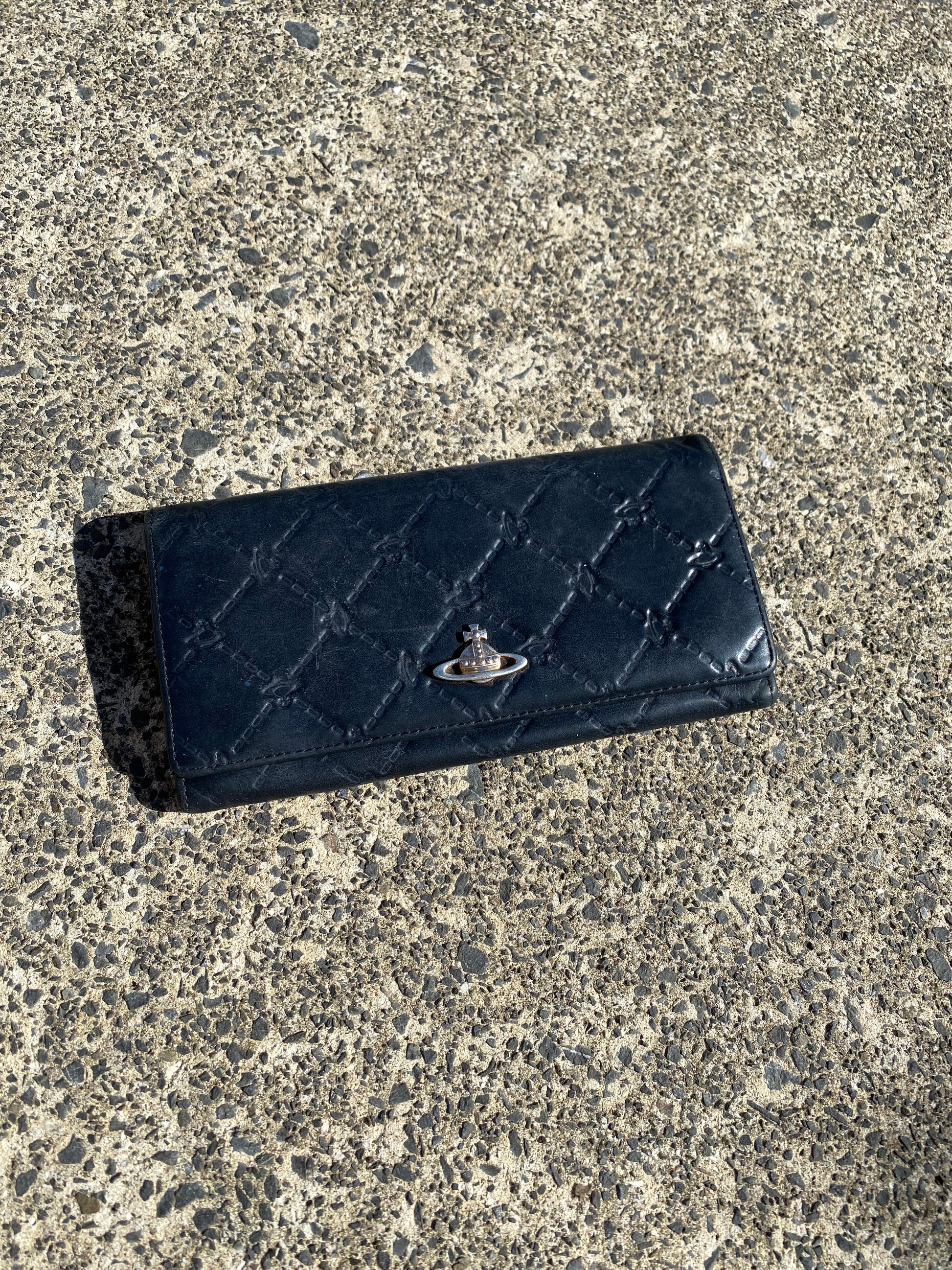 About / Condition: Wallet looks a little blue in this lighting but it is black. A very pretty design inside and out, checkered leather squares with classic orbs scattered around the wallet. Slight wear around the wallet all shown in the photos x.